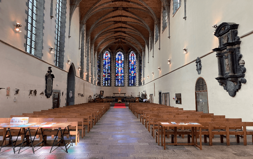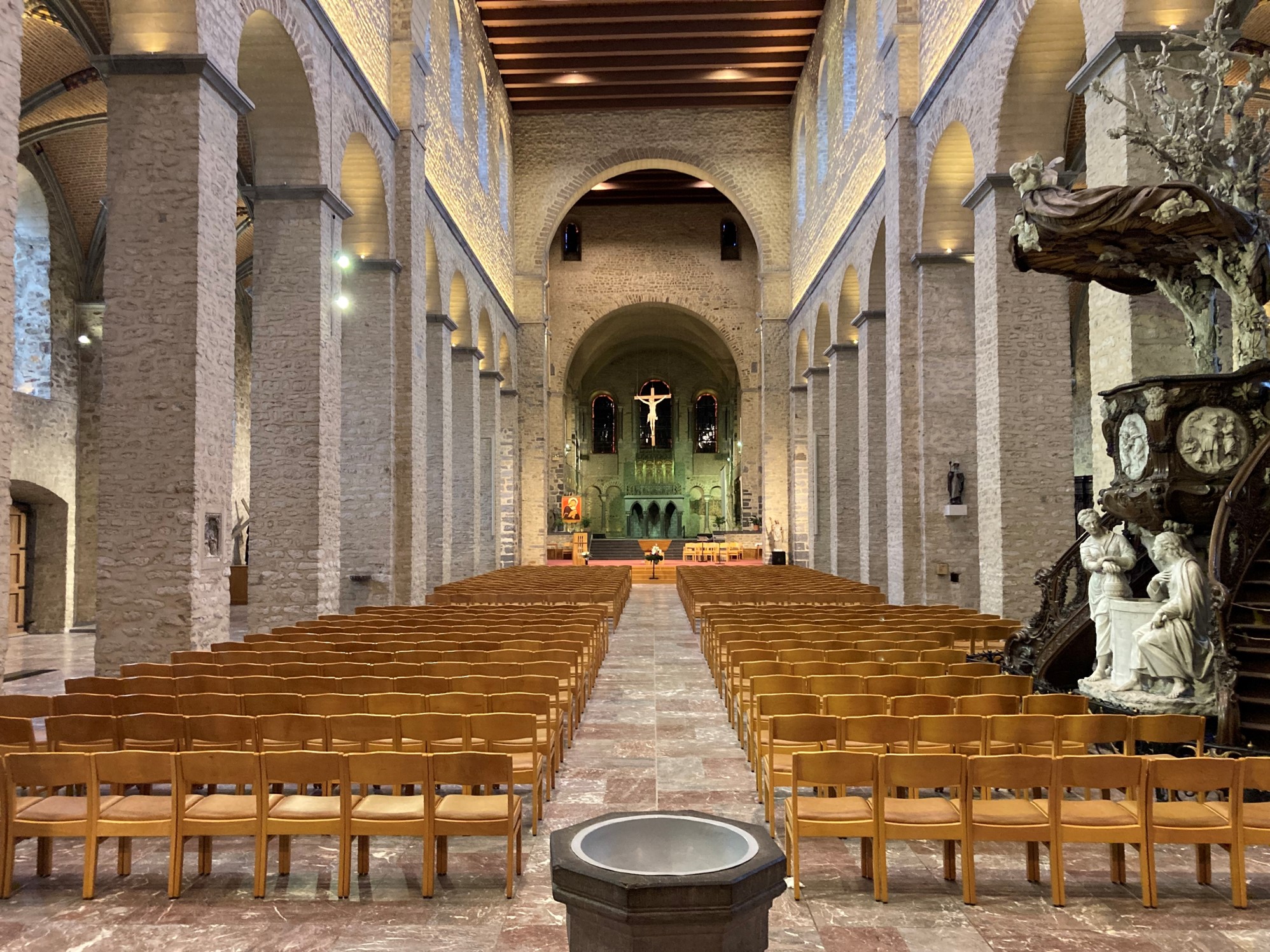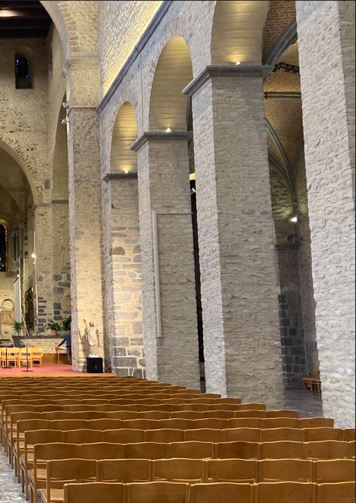 Nivelles – Collégiale. Grâce à la suppression d’une vingtaine de haut-parleurs sur les colonnes, le bâtiment retrouve toute sa beauté et sobriété. L’écho est fortement réduit, rendant la parole claire, chaude et intelligible. Nouveaux diffuseurs digitaux, ton sur ton, très discrets malgré leur grande taille.