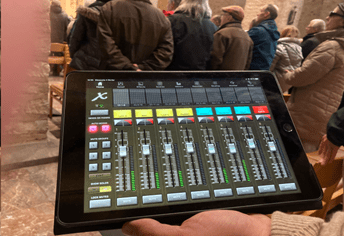 19 entrées de micros, 5 configurations préprogrammées en foncions des chorales, des instruments, … La musique est commandée à distance et, cerise sur le gâteau, le niveau de chaque micro et de chaque haut-parleur se règle depuis l’assemblée par Ipad via le réseau Wifi que nous avons créé.