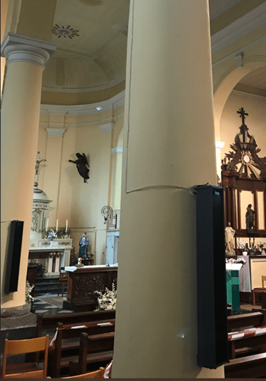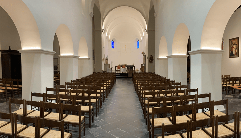 Bruxelles – Eglise Saint Clément. Grâce à la suppression de nombreux haut-parleurs sur les colonnes, le bâtiment retrouve toute sa beauté et sobriété. L’écho est fortement réduit, rendant la parole claire et intelligible. Diffuseurs ton sur ton, décentrés pour une totale discrétion.