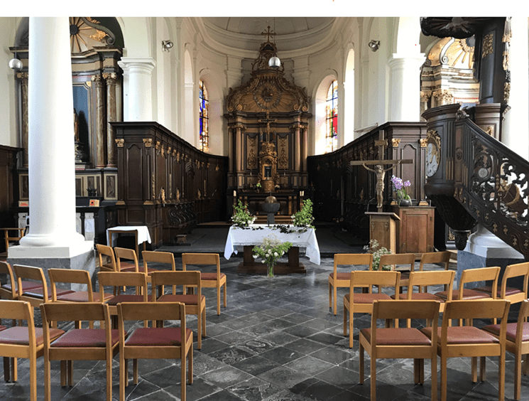 Walhain – Eglise Saint Martin. Cherchez les diffuseurs et les micros, ils sont (quasi) invisibles !! Le son est parfaitement amplifié, avec un rendu chaud et très naturel. Colonne brune sur la boiserie, complémentée par un caisson de basse sous la desserte, amplificateur dans un meuble en chêne.