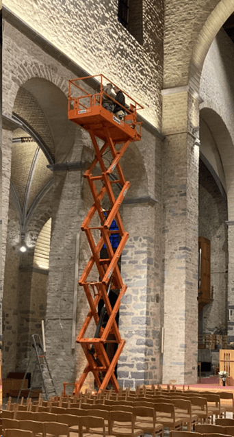 Travaux de câblage en hauteur réalisés par B-Agile : aucune difficulté ne nous arrête.